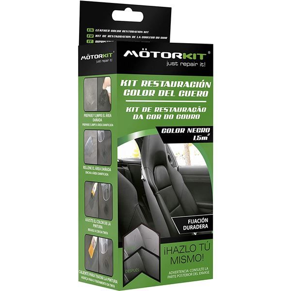 6970625540875DescripciónDetalle de productosPreguntas frecuentesOpinionesKit restauración piel negra | Motorkit MOT10021 kit de restauracion de color de la piel negra.Ideal para: tapicería, ropa, calzado, monederos, muebles, maletas, bolsos, accesorios...Esta diseñado para refrescar las superficies de cuero gastado en articulos como interiores de vehículos, zapatos, chaquetas, muebles, equipajes y mucho más.Restaura el desvanecimiento del color, suaviza el desgaste de la superficie y oculta los arañazos.El kit esta compuesto por:- Limpiador 40 ml.- Aceite reparador 50 ml.- Pintura negra 50ml.- Pegamento reparador 15 ml.- Guantes (2 uds.)- Cepillo (3 uds.)- Espátula (2 uds.)- Manual de instrucciones.