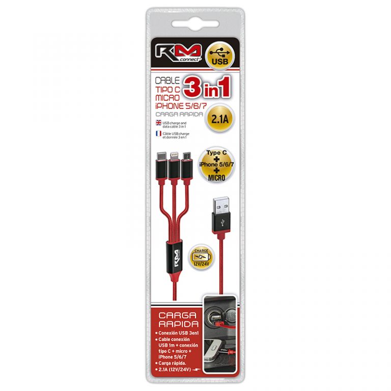 CABLE CARGADOR RM USB 3 EN 1 TIPO-C, MICRO, IPHON