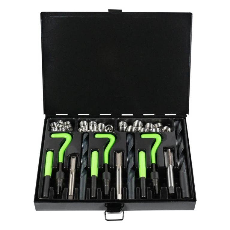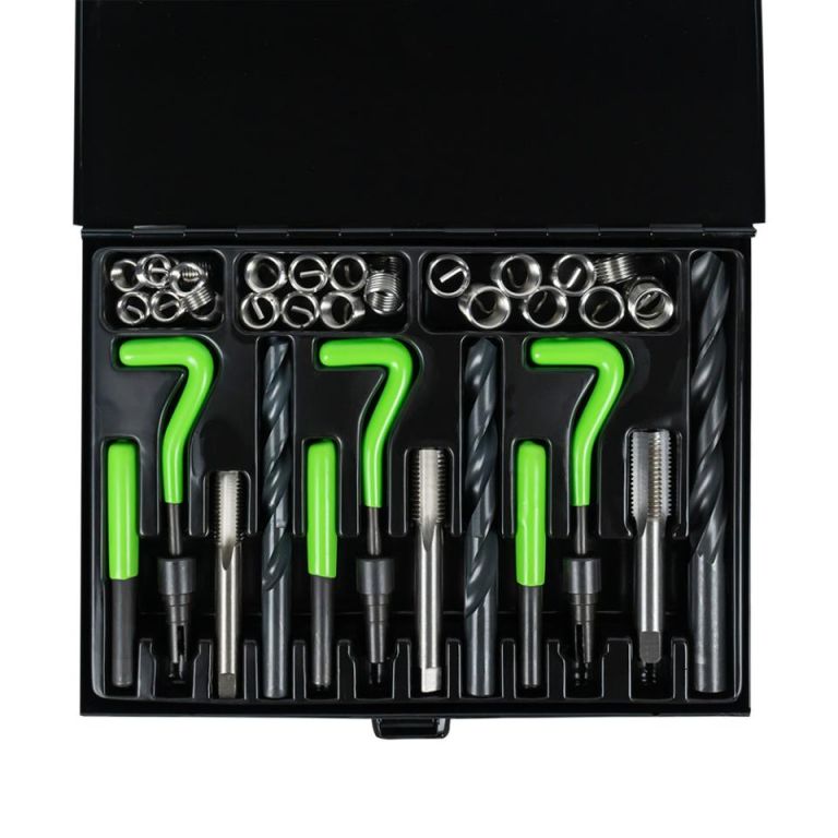 8435034518979Este set está diseñado para la reparación y restauración profesional de roscas dañadas, garantizando una fijación resistente y duradera.El kit incluye las herramientas y componentes necesarios para la reparación de roscas en acero inoxidable en las siguientes medidas: M12x1.75, M14x2.0 y M16x2.0.Incluye:· Brocas correspondientes a cada medida· Terrajas macho de acabado· Insertadores de Helicoil· Punteros de rotura· Inserts Helicoil de acero inoxidable