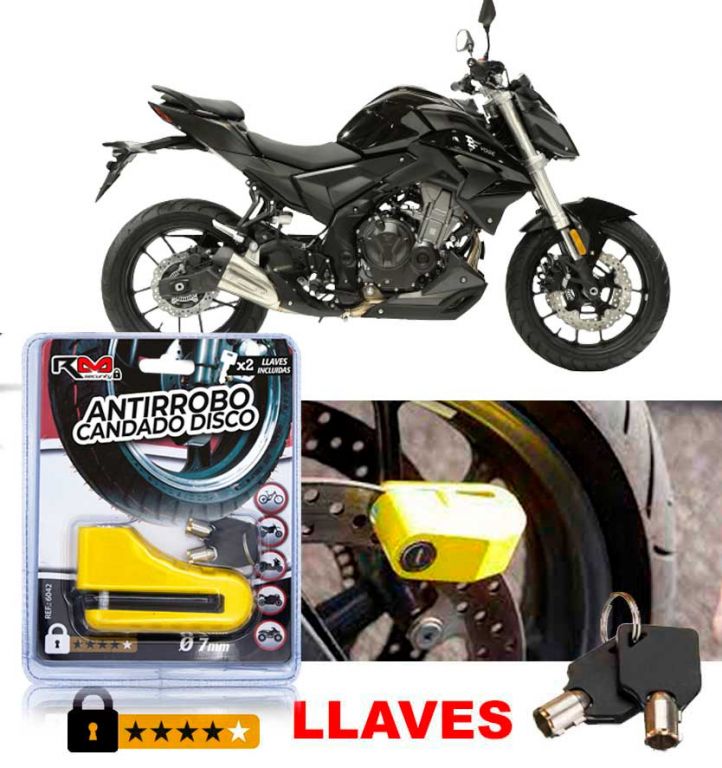 8424099060424Antirrobo candado disco de freno de 7mm, incluye 2 llaves tubularesRecomendaciones:- Recuerde quitar el antirrobo antes de arrancar- Lubrique regularmente el sistema de cerraduraApto para motocicletas, bicicletas y quads
