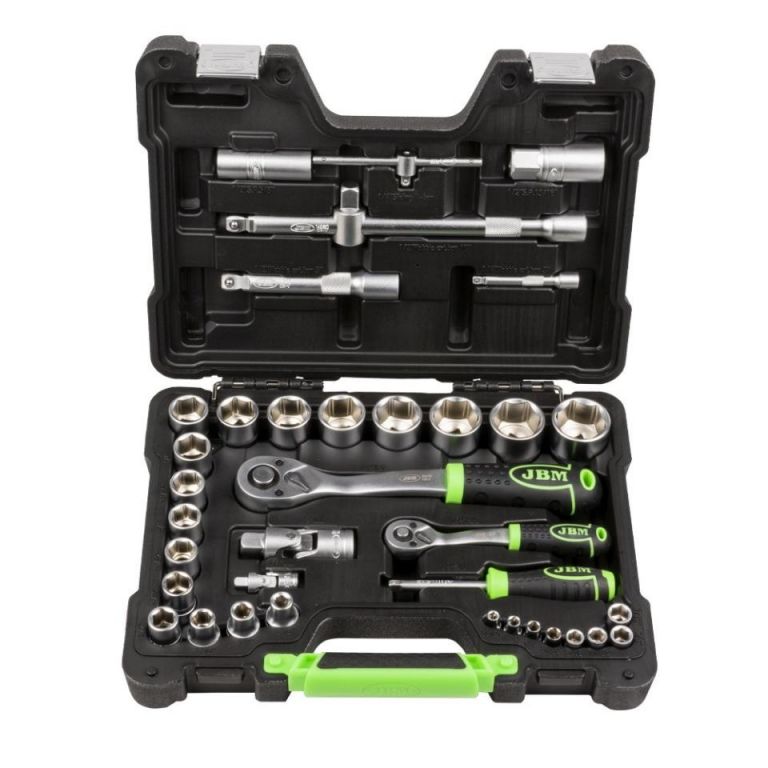 8435034541069Herramientas de 1/2"17 vasos hexagonales en pulgada: 5/16", 3/8", 7/16", 1/2", 9/16", 19/32", 5/8", 11/16", 3/4", 13/16", 7/8", 15/16", 1", 1-1/16", 1-1/8", 1-3/16", 1-1/4"1 carraca de 72 dientes con expulsor de vasos1 articulación universal2 barras de extensión con cabota redonda: 5", 10"2 vasos para bujía: 16, 21mm1 adaptador 3/8" hembra - 1/2" machoHerramientas de 1/4"8 vasos hexagonales en pulgada: 3/16", 7/32", 1/4", 9/32", 5/16", 11/32", 3/8", 7/16".1 carraca de 72 dientes con expulsor de vasos1 articulación universal1 barra de extensión con cabota redonda: 3"1 mango corredizo1 mango destornillador