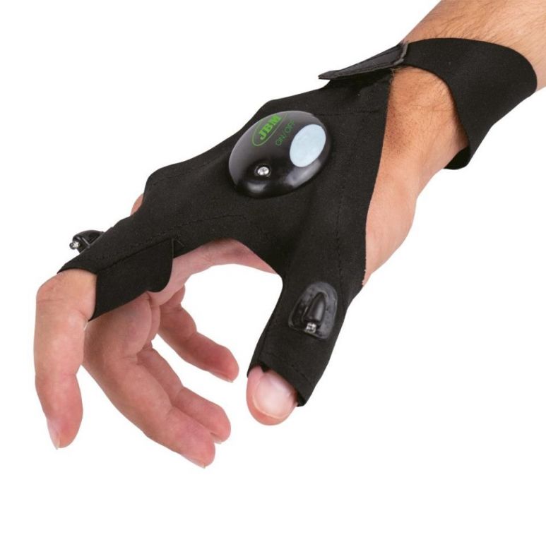 8435034542677- Solo en guante derecho- Guantes con correas de velcro ajustables, se adapta a todo.- Dos pilas de botón: 120mAh, 3V- Dos luces LED.- Doble LED de 5000 mcd- Linterna que no se te puede caer- Luz donde la necesitas.- Ajuste cómodo con neopreno negro de 0,5mm