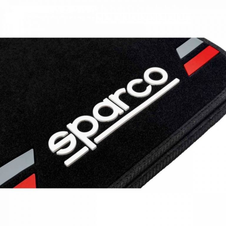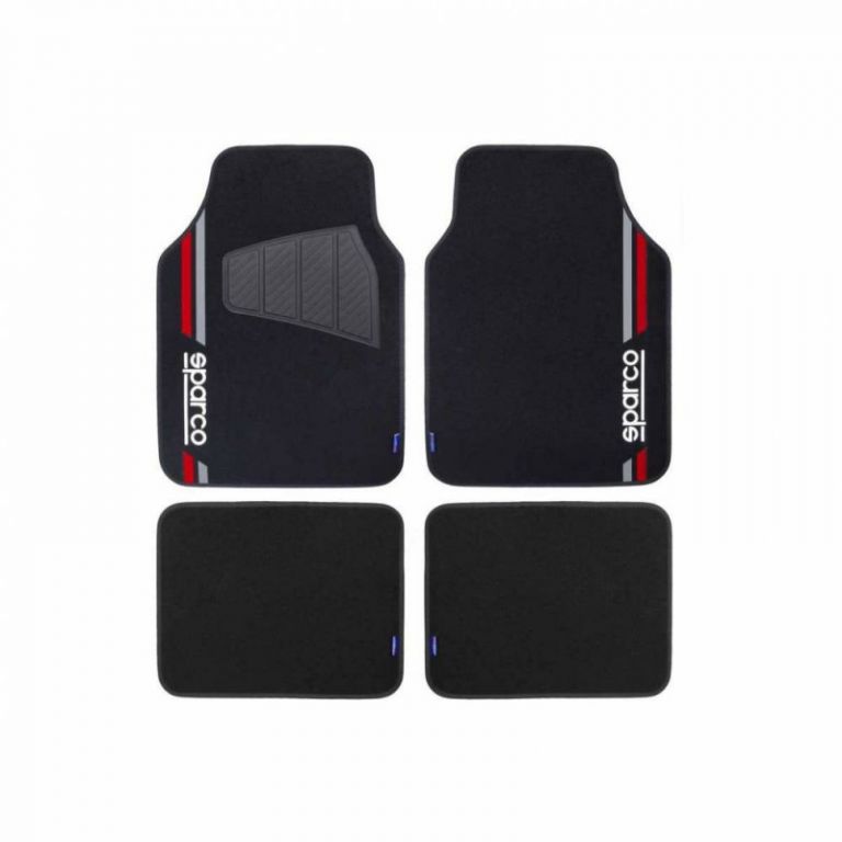 69225163292981 juego de 4 unidades.Alfombras de moqueta negra.Con talonera de goma.Con logo sparco y franja roja de goma.Antideslizantes.Universales.Fáciles de limpiar con un paño húmedo.