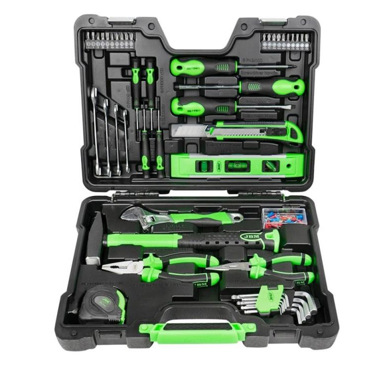 8435034542585Contiene:1 alicate universal de 180mm1 alicate de punta alargada de 160mm1 llave inglesa de 200mm1 cinta métrica 3m1 martillo de 300g1 set de 9 llaves allen cortas: 1.5, 2, 2.5, 3, 4, 5, 6, 8, 10mm1 destornillador plano SL6×1001 destornillador Phillips PH2×1001 destornillador con soporte para puntas imantado4 destornilladores de precisión:Plano: SL2.5×50,SL3×50Estrella: PH000×50,PH00×504 llaves fijas: 6×7, 8×9, 10×11, 12×13mm1 nivel de aluminio 23cm20 puntas de 6mmPlano: SL3, SL4, SL5, SL5.5, SL6Estrella: PH0, PH1, PH2×2, PH3Estrella doble: PZ0, PZ1, PZ2×2, PZ3Torx: T10, T15, T20, T25, T301 cúter profesional 18mm10 cuchillas de recambio para cúter1 caja con 20 conectores de terminales