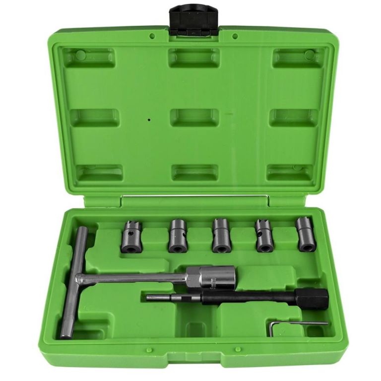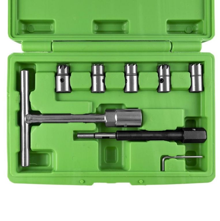 8435034522730Juego de 7 escariadores para limpiar los asientos de los inyectores, cuando en los motores diesel se reacondicionan o sustituyen los inyectores.15x19 de corte plano para aplicaciones universales17x17 de corte plano para BMW / PSA / Renault / FORD17x19 de corte plano para Mercedes CRD17X17 con ángulo de corte para Mercedes-Benz CDi17x21 con ángulo de corte para Fiat/IvecoLlave Allen + Llave en "T" con vaso de 19mm + Adaptador x escariador de 12cm.