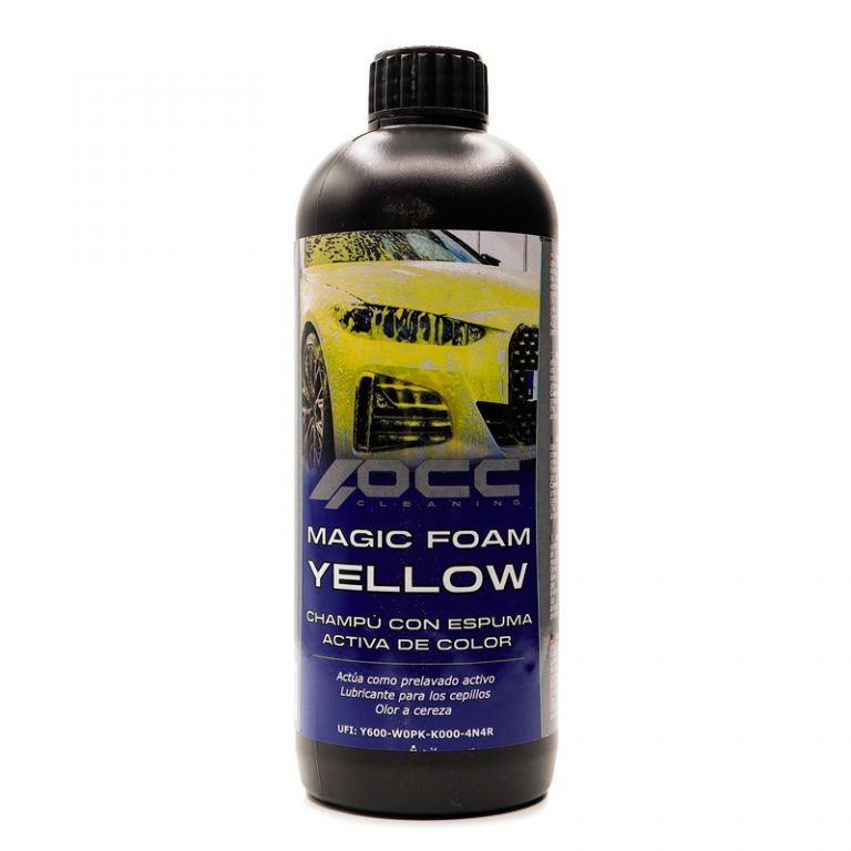 GENERAL: Champú Magic Foam de la marca OCC Motorsport envasado en botella de 500 ml, altamente concentrado para la limpieza exterior de coches, motos, etc (apto para todo tipo de vehículos). Champú activo para aplicar a presión de gran poder espumante que incorpora pigmentos naturales de color amarillo. La especial formulación de este champu para lavar el coche permite la formación de una espuma cremosa y estable de brillante color amarillo, con excelentes propiedades detergentes y lubricantes. Esto aportará un atractivo efecto visual en sus aplicaciones (el color elegido del producto es independiente del color del vehículo).MODO DE EMPLEO: Champú espumante para coche especialmente indicado para su empleo en sistema manual con bomba pulverizadora o con Kärcher con lanza con toma de conexión para botella. Pasos a seguir:*BOMBA PULVERIZADORA MANUAL1. Seleccionar el tipo de boquilla más adecuada en función del tipo de espuma que queremos aplicar y montarla en la bomba (espuma muy densa, media y ligera).2. Añadir 100 ml del champú para coches a la botella de la bomba pulverizadora y rellenar con agua hasta 1 litro. Usar guantes.3. Cerrar muy bien la botella sobre la bomba evitando fugas de aire y agitar.4. Subir y bajar el asa hasta que la válvula de descarga produzca un escape de aire, lo cual nos indicará que la bomba está cargada a la presión correcta de aire (2.5 bar) para proyectar la espuma (MUY IMPORTANTE).5. Apuntar hacia la zona del automóvil y presionar el botón que se encuentra en el asa de la bomba para proyectar la espuma.6. Cubrir el coche de espuma realizando tantas cargas como sea necesario y aplicándola siempre con la presión correcta (2,5 bar). La ausencia de presión en la bomba dará lugar a la ausencia de espuma.7. Dejar actuar durante unos minutos.8. Enjuagar con agua.*BOMBA KÄRCHER CON LANZA1. Llenar la botella de la lanza con el champu para coche Magic Foam. Dicha botella irá roscada a la lanza. Usar guantes.2. Poner en marcha la Kärcher conectada a la red de agua y regular el tipo de espuma con el regulador de la lanza (espuma muy densa, media y ligera).3. Aplicar a presión sobre la superficie del vehículo.4. Cubrir el coche de espuma tanto como se desee.5. Dejar actuar unos minutos.6. Enjuagar solo con agua (anulando con el regulador de la lanza la toma de champú Magic Foam).La espuma obtenida mediante la aplicación del champú para la limpieza exterior del coche actúa como prelavado activo, ayudando a disolver la típica suciedad adherida en la superficie del vehículo, lo cual permite mantenerlos limpios conservando el estado de la plancha del vehículo. Aplicar a coches con la plancha en buen estado. NO aplicar a coches con plancha envejecida, deteriorada por el sol o matizadas, ya que se pueden tintar. En el caso de que se tintara la plancha, se puede quitar el color de la siguiente manera:1. Mezclar 5 litros de agua con 0,5 litros de lejía de uso particular o doméstico.2. Pulverizar esta mezcla sobre la zona tintada y dejar actuar.3. Aplicar jabón y enjuagar con agua.4. Si la suciedad está muy adherida, podría ser necesario pasar un guante de lavado una vez aplicada la espuma.