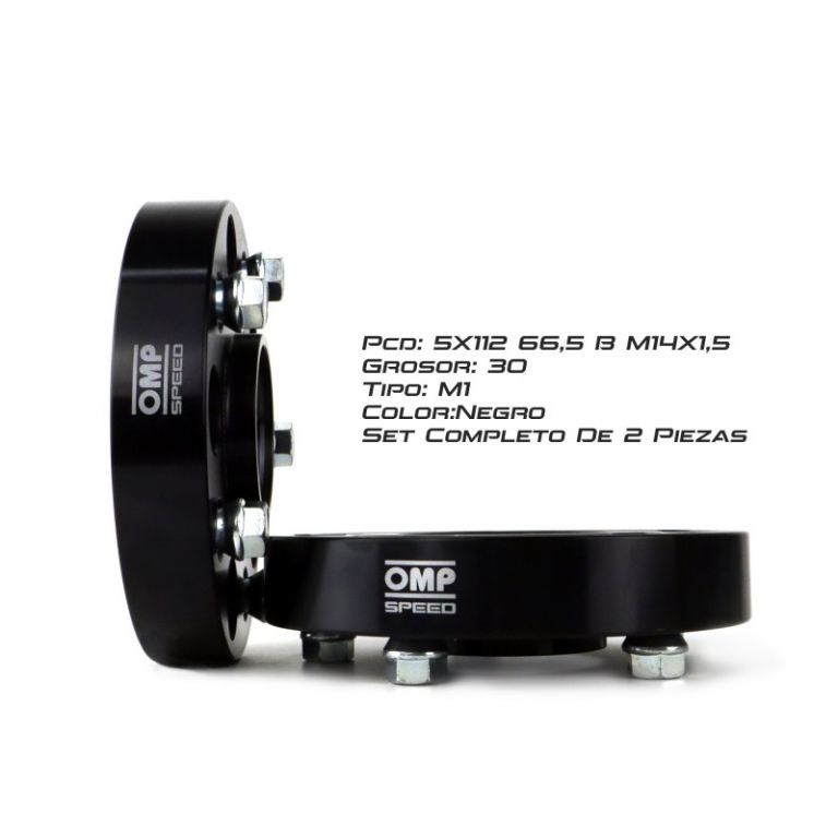 8435682602686MEDIDAS: Set de 2 separadores 5x112 (PCD), con tamaño de los separadores 30mm, CB.H: 66,5 CB.W: 66,5, metrica del tornillo 14x1.5, diametro exterior 150, cantidad de tornillos incluidos: 10.COLOR Y MATERIAL: Separadores de llantas OMP color negro con el logotipo OMP Speed en color blanco. Separadores OMP fabricados en aluminio forjado 6061-T6 (el más resistente del mercado) con una capa de pintura negra térmica protectora anti-corrosión. Son separadores de rueda recomendados para usar principalmente en llantas de aluminio.SEGURIDAD: Separadores para ruedas de coches con ensanchamiento del ancho de vias, proporcionando una mayor estabilidad en la conducción y más seguridad en el paso por curva.