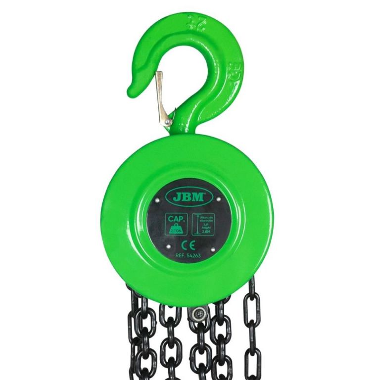 8435034542639Capacidad: 2 tonAltura de elevación: 2,8mNº de ramales: 2Medidas paso cadenaCadena de carga: 6x30mmCadena manual: 4,5x25mmLongitudCadena de carga: 3mCadena manual: 2,5mEsfuerzo para carga máxima: 310NMaterialCadena de carga: Acero 20Mn2Cadena manual: Acero Q235Peso: 12kg