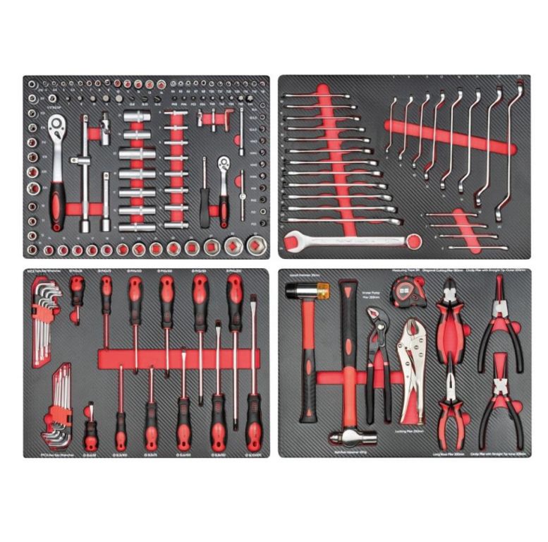 8435034439045MÓDULO 108 PIEZAS CON VASOS HEXAGONALES• 1 Carraca universal de 1/2" con expulsador de vaso• 1 Adaptador de cabezales 1/2"*5/16"• 5 vasos métricos largos de 1/2", medidas: 14, 15, 17, 19 y 22 mm• 17 Vasos métricos de 1/2", medidas: 10, 11, 12, 13, 14, 15, 16, 17, 18, 19, 20, 21, 22,24, 27, 30 y 32 mm• 8 Vasos Torx de 1/2", medidas: E10, E11, E12, E14, E16, E18, E20 y E24• 2 Vasos de bujía de 1/2", medidas: 16 y 21 mm• 2 Barras de extensión de 5" y 10"• 1 Articulación universal de 1/2"• 1 Adaptador 3/8" hembra-1/2" macho• 1 Carraca universal de 1/4" con expulsador de vaso• 18 Cabezales para el destornillador de punta: PH: #1, #2 / PZ: #1 y #2 / HEX: 3, 4, 5, 6mm / SL : 4, 5.5, 6.5 mm / TX : 8, 10, 15, 20, 25, 27 y 30 mm• 1 Mango destornillador de 1/4"• 1 Articulación universal de 1/4"• 1 Mango corredizo de 1/4"• 2 Barras de extensión de 2" y 3"• 13 Vasos métricos, medidas: 4, 4.5, 5, 5.5, 6, 7, 8, 9, 10, 11, 12, 13 y 14 mm• 8 Vasos largos de 1/4", medidas: 6, 7, 8, 9, 10, 11, 12, 13 mm• 5 Vasos Torx de 1/4", medidas: E4, E5, E6, E7 y E8• 17 Cabezales (8 mm): HEX: 7, 8, 10, 12, 14 mm / SL: 8, 10, 12 mm / PH: #3, #4 / PZ:#3, #4 / TX: 40, 45, 50, 55, 60 mm• 3 Llaves Allen: 1.5, 2, 2.5 mm• 1 módulo acabado de fibra de carbonoMÓDULO EVA DE 25 LLAVES COMBINADAS• Módulo de llaves acodadas de 6x7mm a 18x19mm + 20x22mm.• Módulo de llaves combinadas de 6 a 22mm.MÓDULO EVA DE DESTORNILLADORES Y LLAVES HEGAXONALES• Destornillador Phillips - 2x38mm• Destornillador de estrella - PH0x75• Destornillador de estrella - PH1 x 100• Destornillador de estrella - PH2 x 100• Destornillador de estrella - PH3 x 150• Destornillador de estrella - PH4 x 200• Destornillador de ranura - 6x38mm• Destornillador de ranura - SL3 x 100• Destornillador de ranura - 5 x 75mm• Destornillador de ranura - 6x100mm• Destornillador de ranura - 8x150mm• Destornillador ranurado SL10 x 200• Juego de 9 llaves allen en forma de "L" con extremo redondo• Juego de 9 llaves torx en forma de LMÓDULO EVA DE MARTILLOS Y ALICATES• Martillo de bola• Martillo de nylon• Alicate ajustable 10 “• Alicates Seger para interiores de 8“(boca recta)• Alicates Seger para exteriores de 8“(boca recta)• Alicate mordaza 10“• Alicate de corte diagonal 7.5“• Alicate de punta larga de 8“• Cinta métrica 3mMeasuring tape 3m