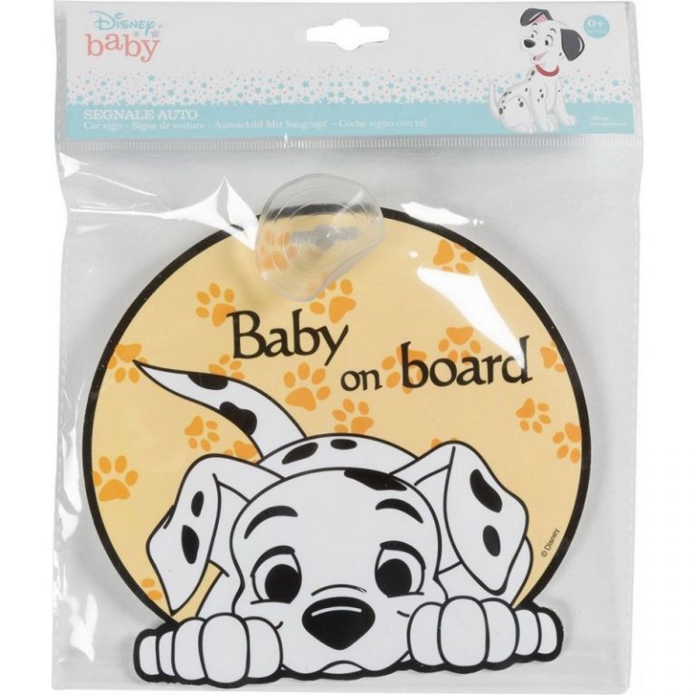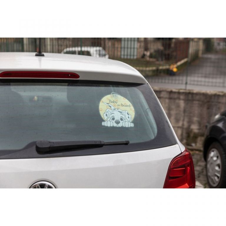 8000866104586Señal de ventosa para coche.Bebé a bordo amarillo apto para la luneta trasera de tu cocheAccesorio de ventosa, fácil de aplicar y quitar.Forma circular, diámetro de unos 20 cm.Gráficos de Disney 101 con un lindo dálmata.