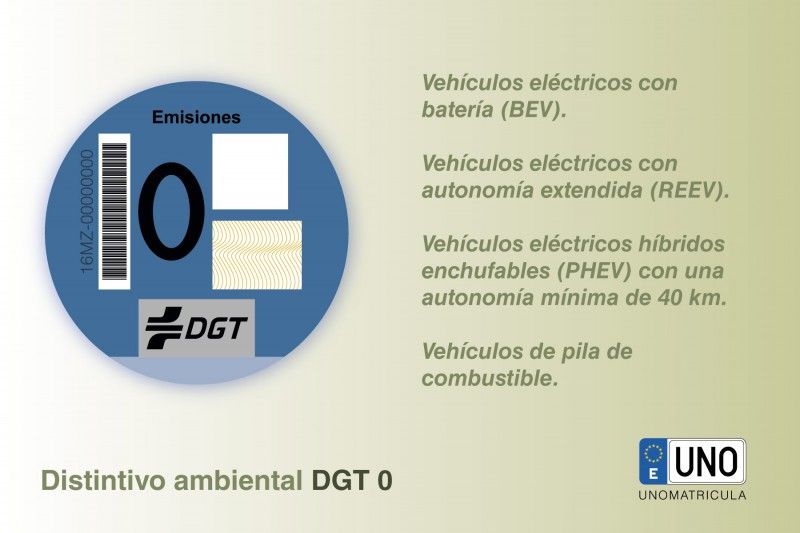 9999212750265El Distintivo Ambiental DGT es una etiqueta que permite identificar rápidamente a los vehículos más respetuosos con el medio ambiente. Debe colocarse en el ángulo inferior derecho del parabrisas y, aunque es voluntaria, se recomienda tenerla:Material: adhesivoTamaño: diámetro 97mm (vehículos y furgonetas) y 87mm (motocicletas).Existen cuatro tipos de Distintivo, en función del potencial contaminante:1. Distintivo cero emisiones, de color azul, se aplica a:Vehículos eléctricos con batería (BEV).Vehículos eléctricos con autonomía extendida (REEV).Vehículos eléctricos híbridos enchufables (PHEV) con una autonomía mínima de 40 km.Vehículos de pila de combustible.2. Distintivo eco, de color verde y azul, se aplica a:Vehículos híbridos enchufables con autonomía inferior a 40 km.Vehículos híbridos no enchufables (HEV).Vehículos propulsados por gas natural.Vehículos propulsados por gas natural (GNC y GNL) o gas licuado del petróleo (GLP).3. Distintivo C, de color verde, se aplica a:Turismos y furgonetas ligeras de gasolina, matriculadas a partir de enero de 2006.Turismos y furgonetas ligeras diésel matriculadas a partir de 2014.Vehículos de más de 8 plazas y pesados, de gasolina o diésel, matriculados a partir de 2014.Los vehículos de gasolina deben cumplir la norma Euro 4,5 y 6, y los diésel la Euro 6.4. Distintivo B, de color amarillo, se aplica a:Turismos y furgonetas ligeras de gasolina matriculadas a partir de enero de 2000.Turismos y furgonetas ligeras diésel matriculadas a partir de enero de 2006.Vehículos de más de 8 plazas y pesados, de gasolina o diésel, matriculados a partir de 2005Los vehículos de gasolina deben cumplir la norma Euro 3, y los diésel la Euro 4 y 5.