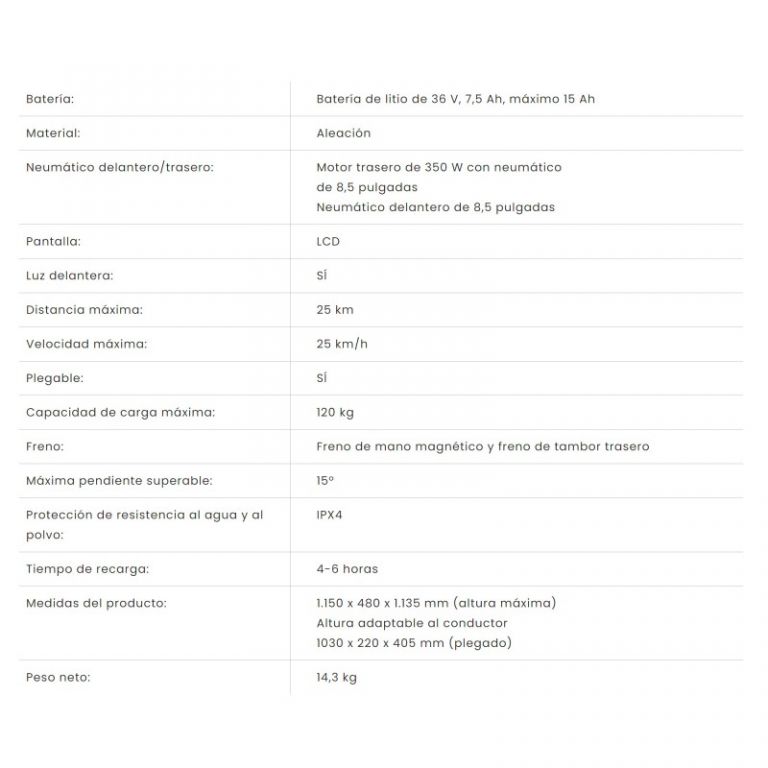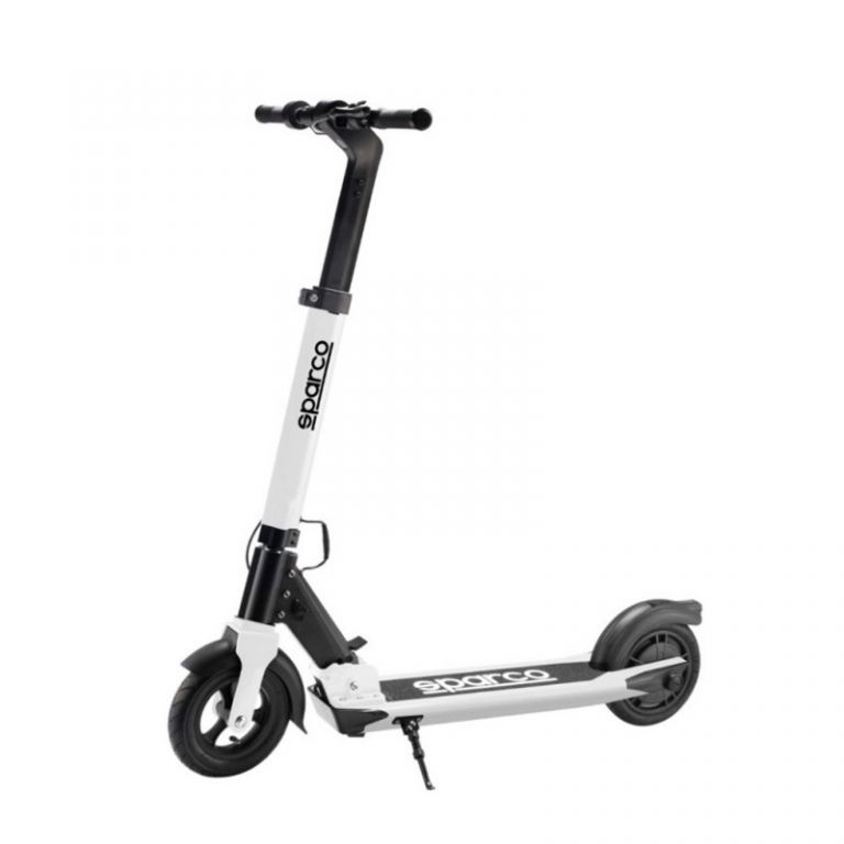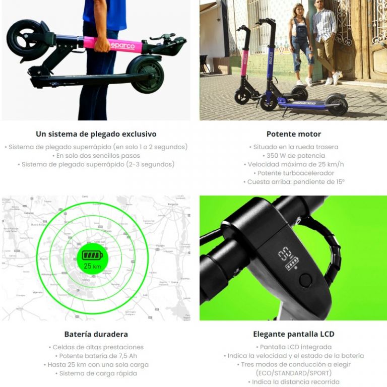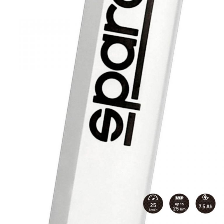 8033280372132El patinete eléctrico Sparco eMobility será pronto su manera preferida de desplazarse por la ciudad. Con una velocidad máxima de 25 km/h, podrá recorrer hasta 35 km con una sola carga. Llegará a su destino de forma más rápida y segura con sus ruedas de 8,5 pulgadas, freno trasero, amortiguadores y una pantalla LCD que muestra las estadísticas del itinerario (velocidad y distancia recorrida, así como niveles de batería). Un sistema de plegado cuidadosamente diseñado permite además guardarlo fácilmente optimizando el espacio, completando así el desplazamiento más ecológico posible.