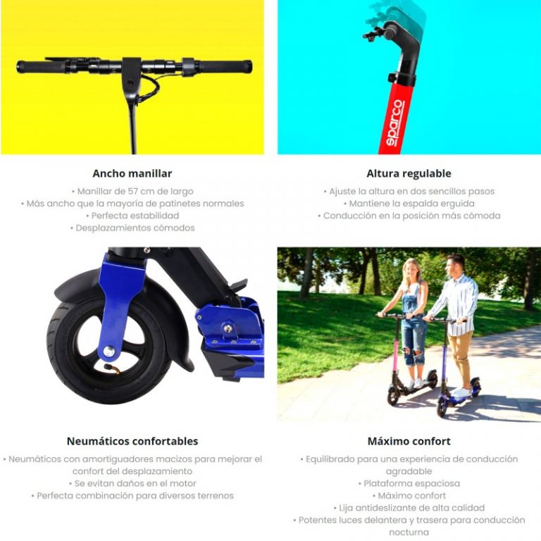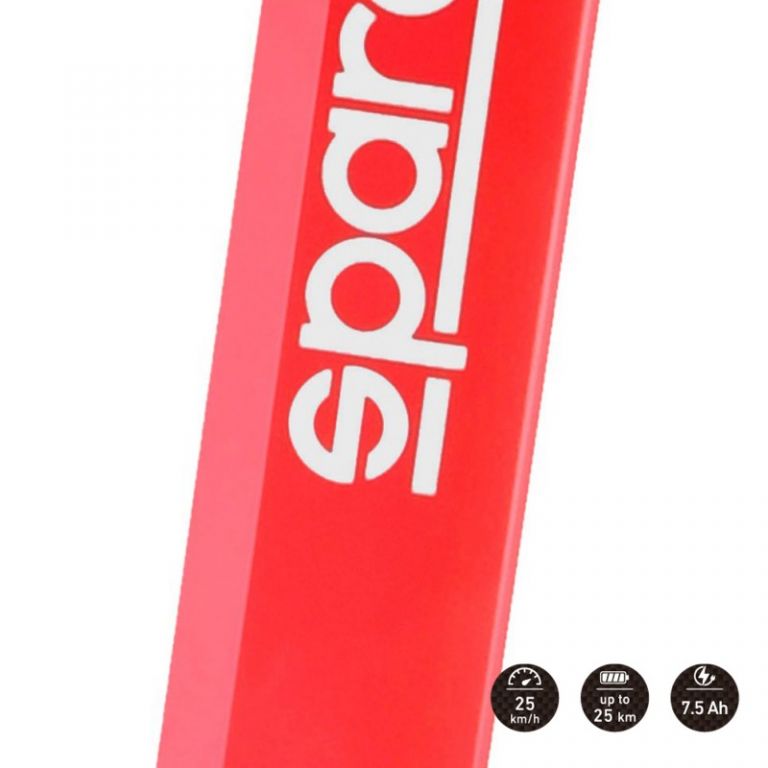 8033280372095El patinete eléctrico Sparco eMobility será pronto su manera preferida de desplazarse por la ciudad. Con una velocidad máxima de 25 km/h, podrá recorrer hasta 35 km con una sola carga. Llegará a su destino de forma más rápida y segura con sus ruedas de 8,5 pulgadas, freno trasero, amortiguadores y una pantalla LCD que muestra las estadísticas del itinerario (velocidad y distancia recorrida, así como niveles de batería). Un sistema de plegado cuidadosamente diseñado permite además guardarlo fácilmente optimizando el espacio, completando así el desplazamiento más ecológico posible.