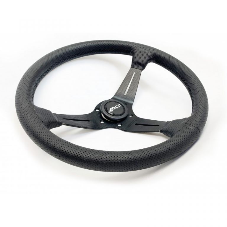 8434207003502GENERAL: Volante de competicion OCC Motorsport modelo Classic original y de calidad diseñado para proporcionar gran elegancia a tu coche. Esta decoracion extra hara que tu vehiculo tenga un look mas atractivo. Es un volante desplazado con 6 tornillos de cogida.MATERIAL Y COLOR: Volante con terminacion en piel artificial perforada para generar una comoda y suave sensacion al colocar las manos en el volante. Volante de coche color negro y costuras negras. Cuenta con 3 brazos de aluminio negro. Por otro lado, es un volante coche deportivo antideslizante. Esta caracteristica es fundamental para un mayor confort, ya que las manos no se te resbalan. ¡Conseguiras un mayor control durante la conduccion!MEDIDAS: Volante 350mm de diametro. Es el tamaño idoneo en volantes para coche, ya que te ayudara a conducir de una manera mas segura y comoda. Ademas, podras realizar curvas con mucho menos esfuerzo. Este volante racing tiene un grosor de 32 mm: ideal para un agarre mas efectivo. Es un volante desplazado que cuenta con una profundidad de 90 mm.INSTALACION: Volante de fácil instalación, aunque se recomienda una instalacion profesional. Importante: El cono de volante se necesita para su instalacion (tiene que ser usado con cono/piña nardi). Este volante universal se puede poner en la mayoria de modelos de coche. Además, es un volante de carreras popularmente usado para simuladores. Por otro lado, si tienes pensado poner este volante en un vehículo de calle, solo podras homologarlo si el coche no tiene airbag en el volante. En el caso de que tu coche no lleve airbag, podras homologarlo sin problema (para homologar hay que hacer proyecto y reforma de laboratorio para incluirlo en ficha tecnica).