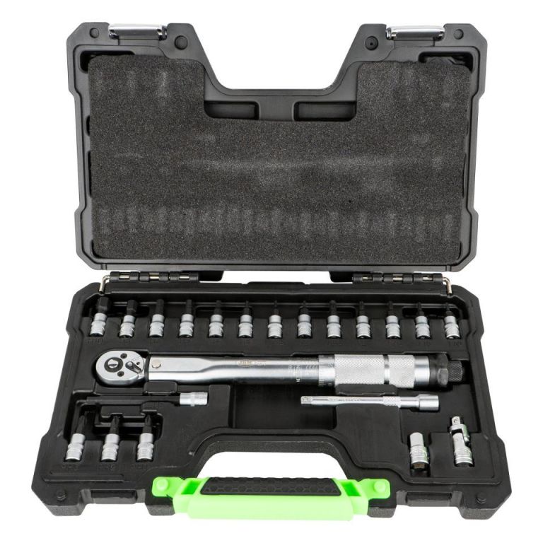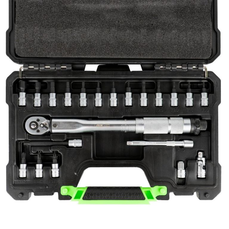 8435034542691Herramientas de 1/4"1 llave dinamométrica (5-25Nm)1 barra de extensión de 100mm1 articulación universal1 adaptador 1/4" hembra-3/8" macho17 cabezales para el mango destornillador:Estrella: PH1, PH2, PH3Hexagonal (37mmL): H2, H2.5, H3, H4, H5, H6, H8, H10Hexagonal (87mmL): H5Torx: T10, T15, T20, T25, T30