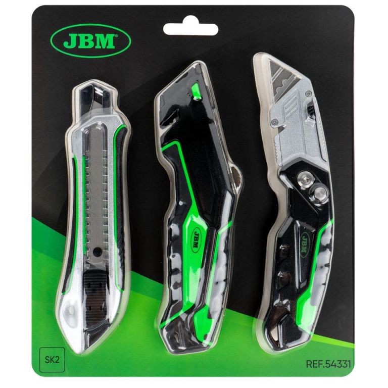 8435034543315Juego de 3 tipos diferentes cutters:- Cutter estándar- Cutter con hoja de trapecio- Cutter abatible con hoja de trapecioLos cutters con hoja de trapecio incluyen 3 hojas de recambio dentro del mango.Cutter estándarMaterial hoja: Acero SK2Medidas hoja: 100x10mmLongitud: 160mmPeso: 129,7gCutter con hoja de trapecioMaterial hoja: Acero SK2Medidas hoja: 60x19mmLongitud: 175mmPeso: 115,5gCutter abatible con hoja de trapecioMaterial hoja: Acero SK2Medidas hoja: 60x19mmLongitud: 175mmPeso: 115,5g
