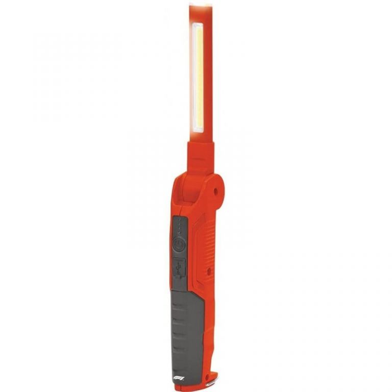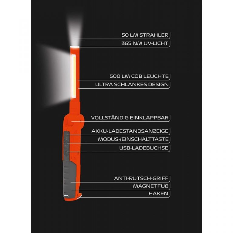 4038373002754Luz de taller ultradelgada y totalmente retráctil y moderna tecnología LED COB para una iluminación intensaHasta 500 lúmenes de luz de superficie más 50 lúmenes en modo antorchaLuz UV de 365 nm para detección de fugas y temperatura de color de 6500 KelvinIndicador de nivel de batería y batería de iones de litio de 2600 mAhFuerte base magnética y gancho para fijación.Mango antideslizante y recargable mediante cable USBCable USB tipo C incluido