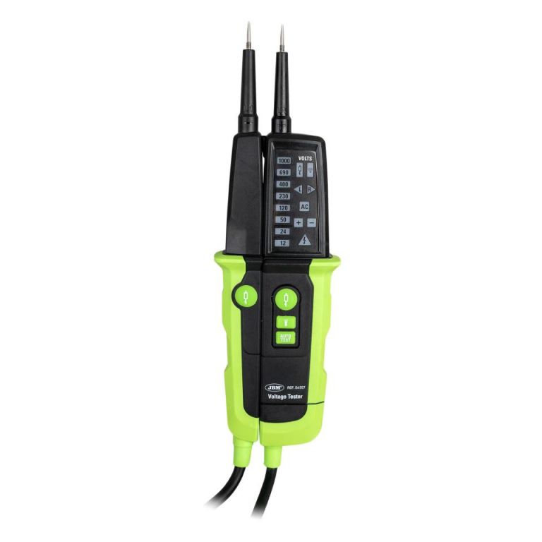 8435034545579DetallesEste dispositivo portátil está diseñado para medir la tensión eléctrica en circuitos, tomas de corriente, cables y otros dispositivos eléctricos. Con su pantalla digital y sus sondas de medición, el comprobador de voltaje, proporciona lecturas precisas de la tensión.ESPECIFICACIONES TÉCNICAS:Rango de voltaje del LED 12V a 1000V CA/CCResolución del LED ±12,24,50,120,230,400,690,1000V CA/CCTolerancias Cumple con EN 61243-3:2014Rango de frecuencia 0/40Hz a 400HzTiempo de respuesta =1 segundoEncendido automático Encendido automático =12V CA/CCDetección de voltaje AutomáticoDetección de polaridad Rango completoDetección de rango AutomáticoImpedancia básica de carga interna Máximo 3.5 mA a 1000 VCorriente máxima instantánea 350 ?O / Is<3.5 mA (sin disparo de RCD)Tiempo de funcionamiento 30 segundosTiempo de recuperación 240 segundosPrueba de continuidad 0 a 400 ?OPrecisión Resistencia nominal +50%Corriente de prueba =5 µACarga conmutable ~ 7 ?OCorriente máxima instantánea Is (carga)= 150mADisparo del RCD ~ 30mA@230VFase de polo único 100V a 1000V CARANGO DE FRECUÉNCIA:Indicación de campo giratorio Indicación de campo giratorioRango de voltaje (LED) 100-1000VRango de frecuencia 50/60HzPrincipio de medición Electrodo de polo doble y contacto