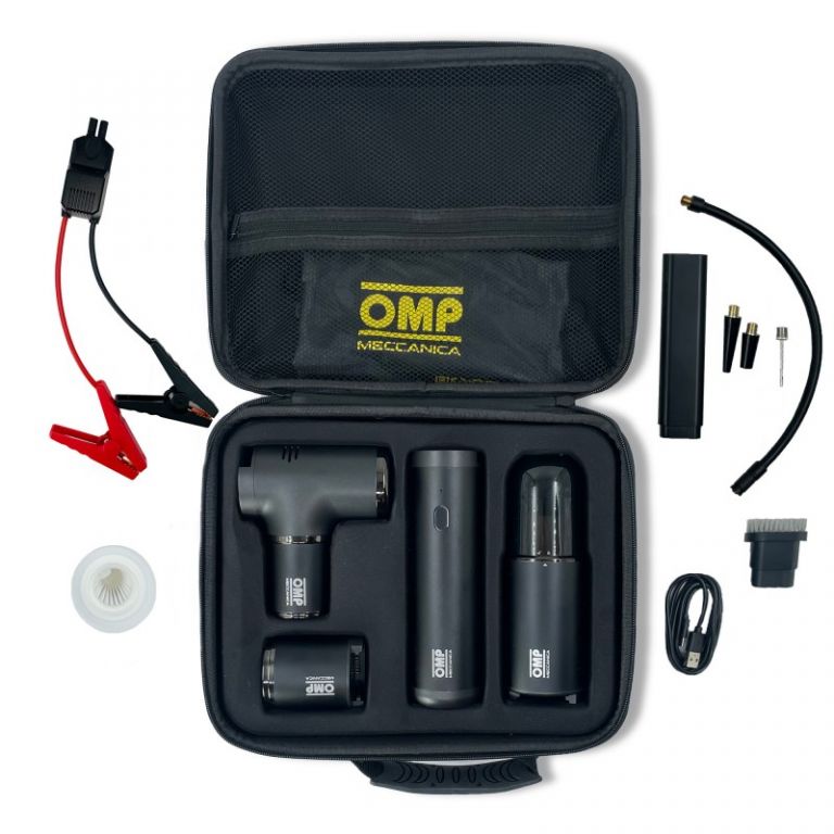 8435682606226kit combinado portátil multifunción 5 en 1 de OMP Mecánica fabricado en aluminio y ABS.Banco de energía:- Batería: Litio 14.8V 10000mAh/38.48Wh (2600mAh X 4)- Salida: USB 5V-3.0A (Max)- Entrada: USB Tipo-C 5V-2.0A- Ciclos: <20 (Carga completa)Arrancador de motor:- Batería: Litio 14.8V 10000mAh/38.48Wh (2600mAh X 4)- Corriente de arranque/pico: 300A/500A- Tensión de arranque del motor: 12V- Motor: ? Gasolina 6.0L Diesel 3.0L- Ciclos: <10 (con carga completa)Aspiradora:- Voltaje nominal: 10V- Potencia nominal: 90W - 9A- Fuerza de succión: Max 8000Pa- Velocidad del motor: Max 54000rpm- Ruido: ?70dB- Tiempo de funcionamiento con carga completa: <22min- Filtro: HEPA X2 (lavable y reutilizable)- Accesorios: Boquilla de succión y cepillo de limpiezaInflador multiusos: - Presión de aire: 150 psi- Flujo de aire: 17 l/min- Ciclos: <6 neumáticos 0-2,5bar (Completamente cargado)- Accesorios: Tubo de inflado, 2 tamaños de adaptadores multiusos y - boquilla de aguja de bola función de protección de calor apagado - automático 15 minutosLinterna Led:- Potencia: 3W Led- Luminosidad: 260 Lumen- Color: 6000K- Light Distance: 100 Metros- Modos: 4 (Alto, Bajo, Flash y SOS)