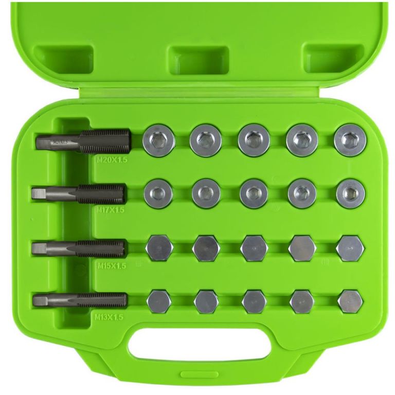 8435034513370DetallesINCLUYE:· Tapones de SKS3· Brocas de 1015· Arandelas de CobreCONTIENE:- M13X1,5P- M15X1,5P- M17X1,5P- M20X1,5P- Brocas: 1 unidad por medida.- Tapones: 5 unidades por medida.- Arandela: 10 unidades por medida.