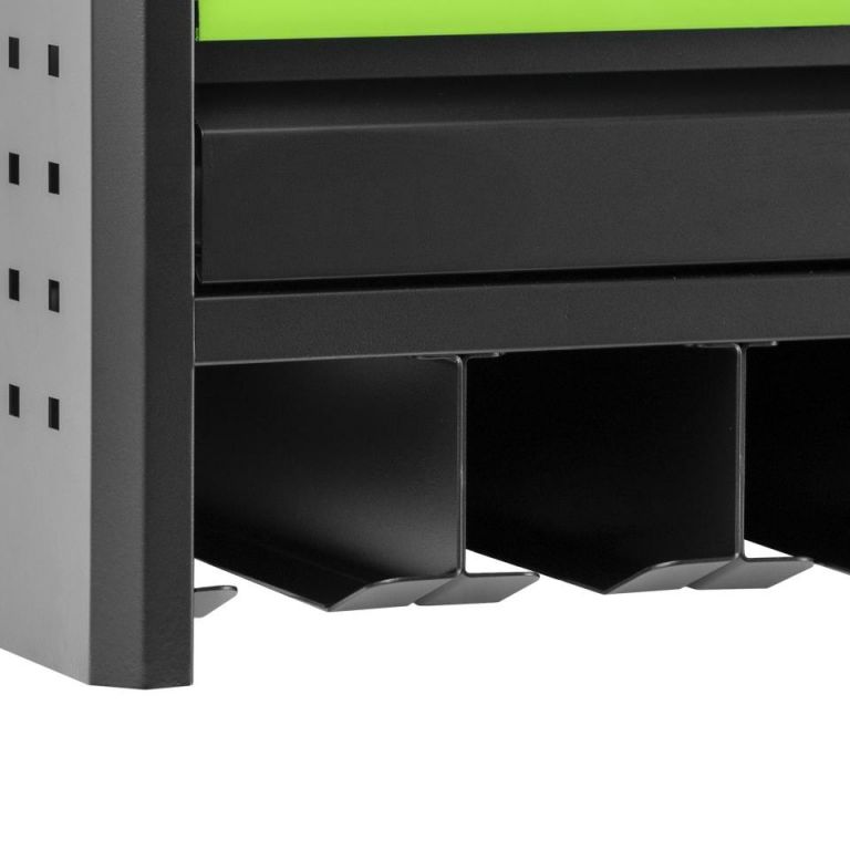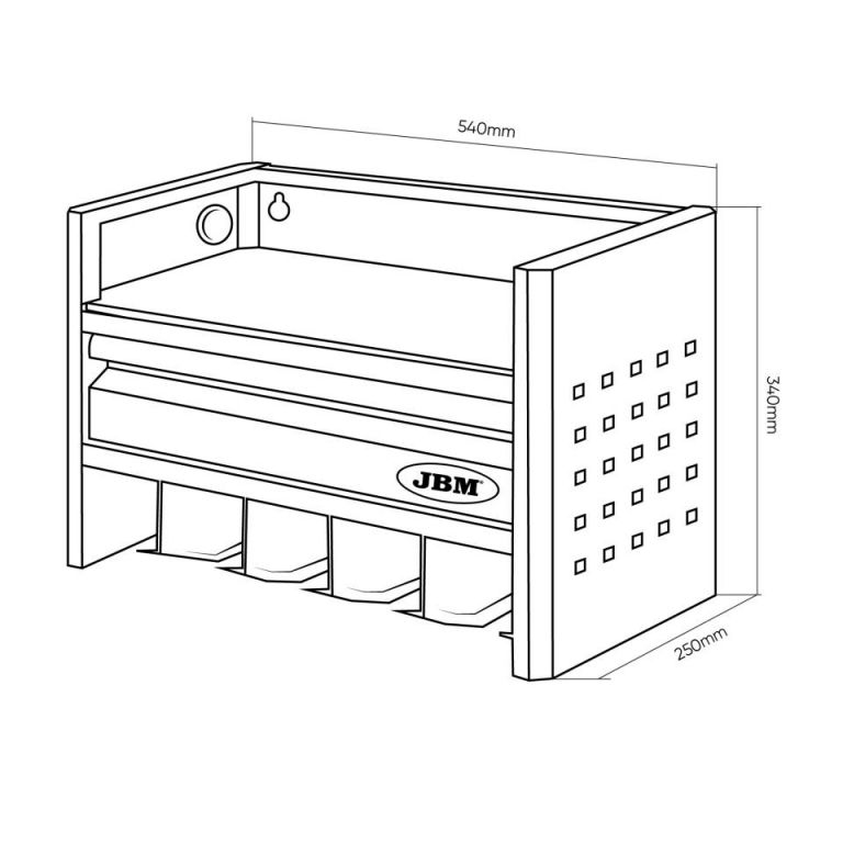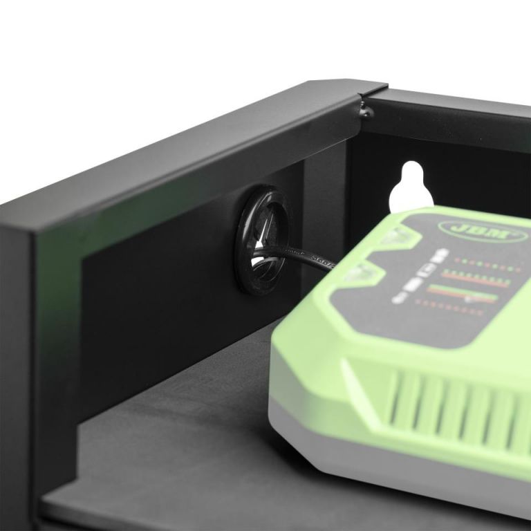 8435034547849Diseñado especialmente para herramientas eléctricas. Fabricado en acero duradero y con acabados de calidad, este sistema modular te permite mantener tus herramientas siempre a mano, seguras y perfectamente ordenadas.Características principales:· 3 niveles de almacenamiento que optimizan el espacio vertical y te permiten clasificar herramientas por uso o tamaño.· Soportes integrados para hasta 5 herramientas eléctricas JBM, con encaje firme y seguro.· 1 cajón metálico con capacidad de carga de hasta 3 kg, ideal para almacenar piezas pequeñas, accesorios o consumibles.· Plataforma especial para baterías y cargador, pensada para un acceso rápido y una carga organizada que incluye pasacables con protección de goma, para mantener tus cables ordenados y sin riesgo de cortes o daños.· Rejilla lateral multiuso, perfecta para colgar ganchos, destornilladores, llaves o cualquier herramienta de uso frecuente.